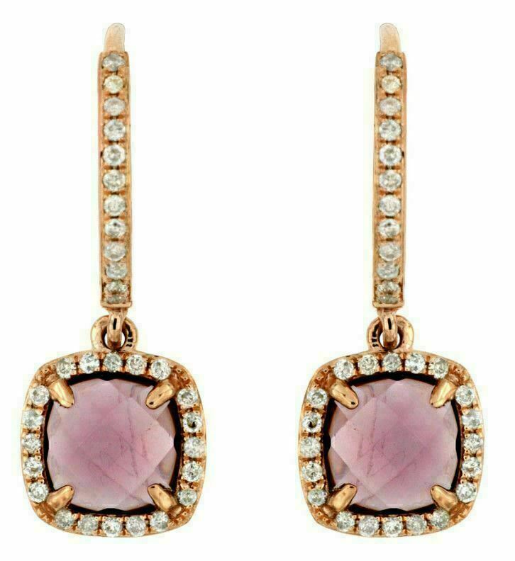 ESTATE 14KT ROSE GOLD HANGING EARRINGS. 3D HALODESIGN. ROUND DIAMONDS ARE F/G COLOR, VSSI CLARITY .25 CARATS. AAA EXTRA FACETED CUSHION CUT RHODOLITE ARE 2.40CARATS.WRITTEN APPRAISAL AVAILABLE. COMES IN A PRESENTABLE GIFT BOX.