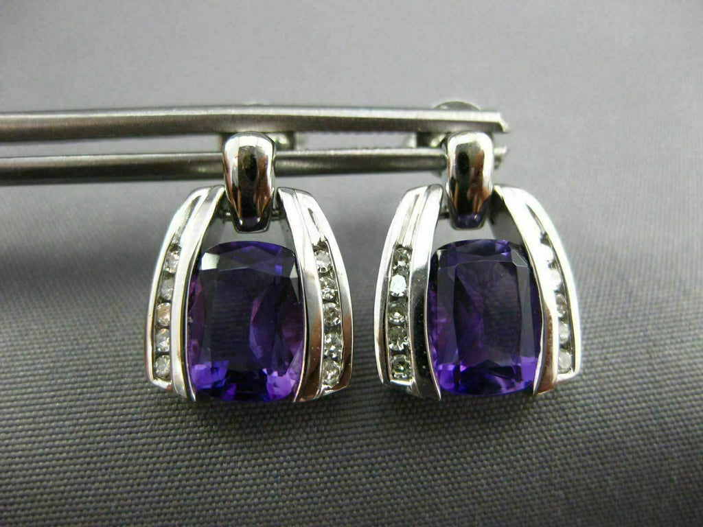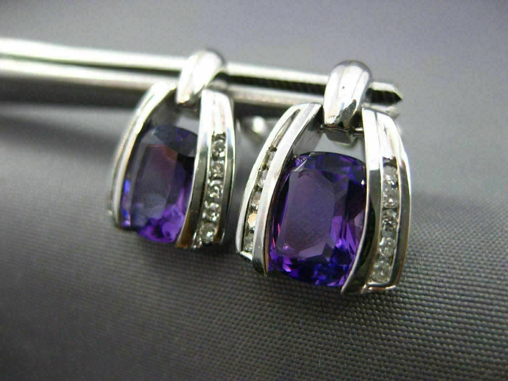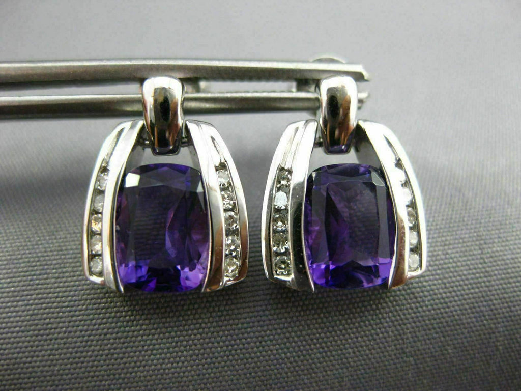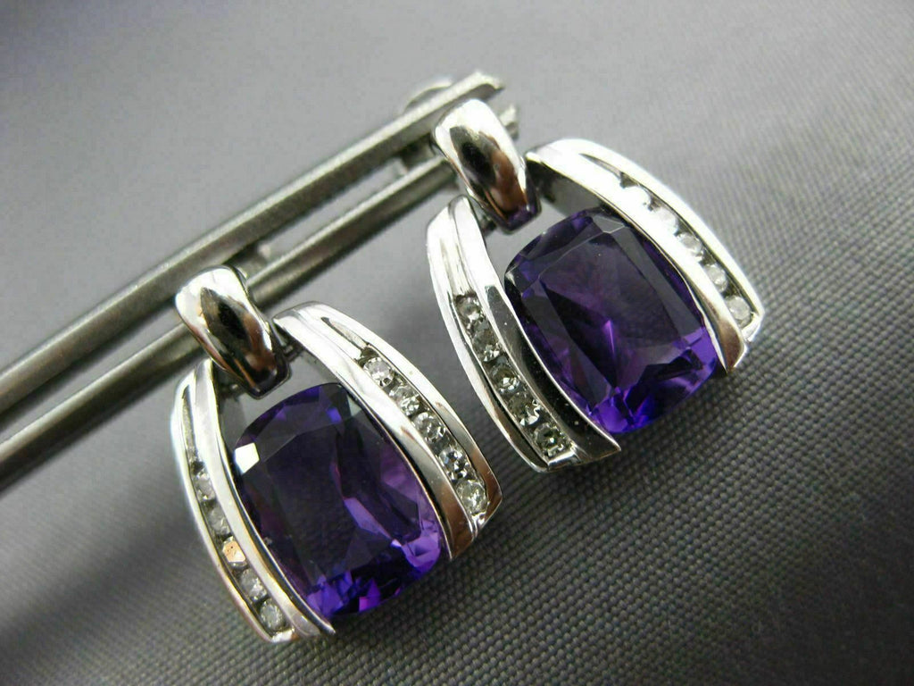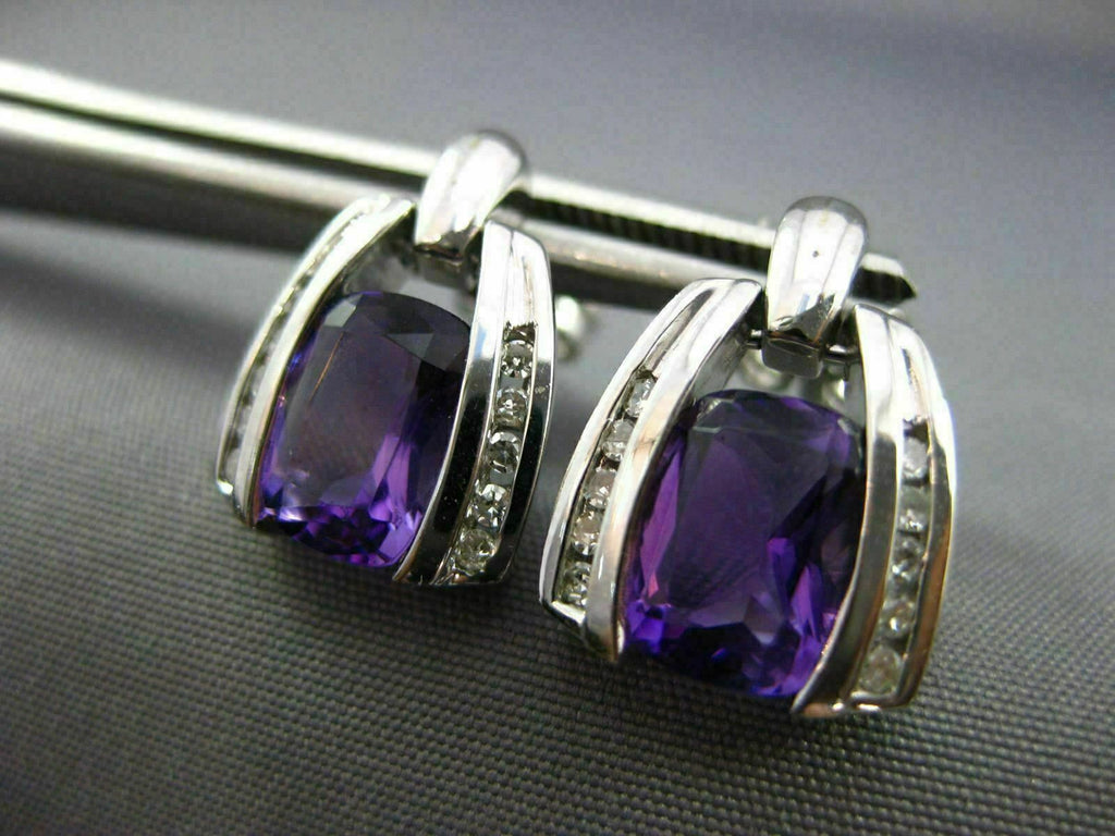 ESTATE 14KT WHITE GOLD HANGING EARRINGS. 3D TENSION TRIANGULAR DESIGN. DIAMONDS ARE G/H COLOR, VSSI CLARITY .16 CARATS. AAA EXTRA FACET AMETHYST IS 2.70 CARATS. MEASURES 15mm X 11mm. WRITTEN APPRAISAL AVAILABLE. COMES IN A PRESENTABLE GIFT BOX.