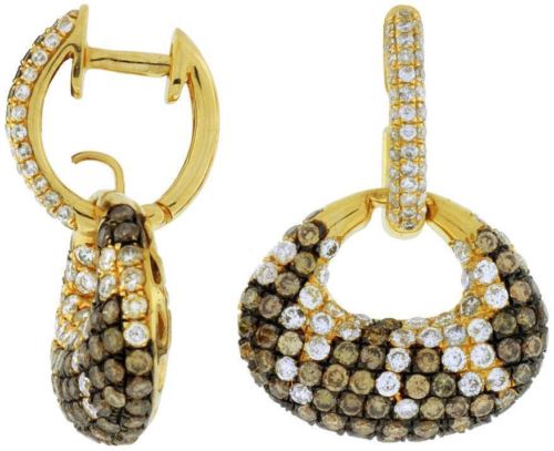 ESTATE 14KT YELLOW GOLD HANGING EARRINGS. 3D MULTI ROW TEAR DROP DESIGN. DIAMONDS ARE F/G COLOR, VSSI CLARITY 1.25 CARATS. BLACK DIAMONDS ARE 1.60 CARATS. WRITTEN APPRAISAL AVAILABLE. COMES IN A PRESENTABLE GIFT BOX.