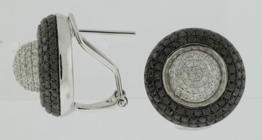 ESTATE 14KT WHITE GOLD CLIP ONEARRINGS. 3D CIRCULARDESIGN. WHITE DIAMONDS ARE F/G COLOR, VSSI CLARITY 0.77CARATS.BLACK DIAMONDSARE 2.20 CARATS.WRITTEN APPRAISAL AVAILABLE. COMES IN A PRESENTABLE GIFT BOX.