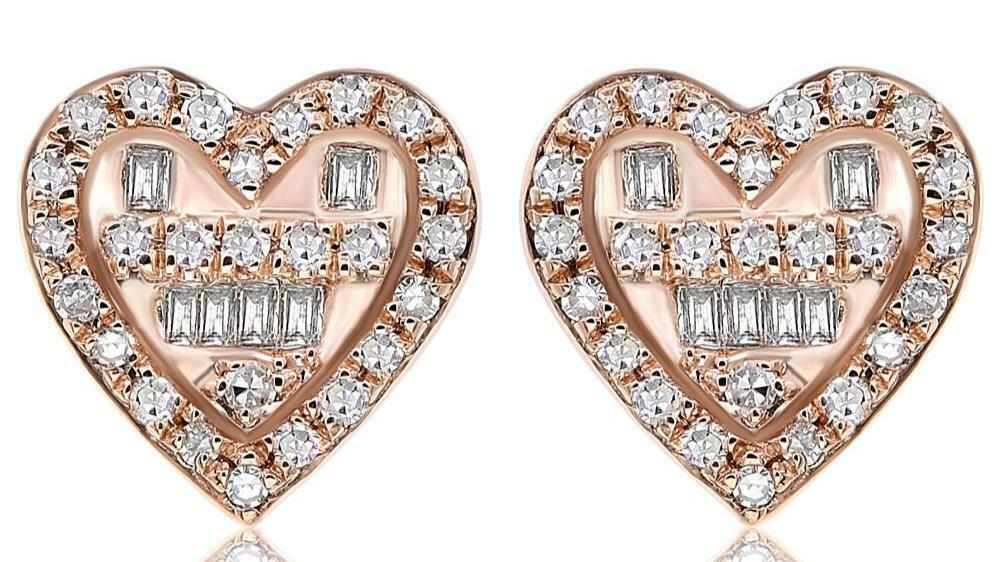ESTATE 14KT ROSEGOLD STUDEARRINGS. 3D HEART SHAPEDESIGN. ROUND AND BAGUETTEDIAMONDS ARE F/G COLOR, VSSI CLARITY .21CARATS.WRITTEN APPRAISAL AVAILABLE. COMES IN A PRESENTABLE GIFT BOX.