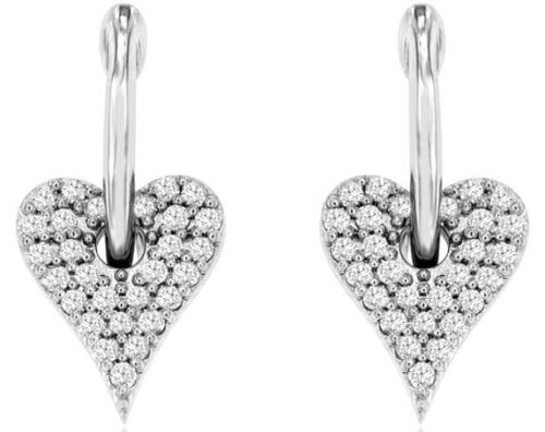 ESTATE 14KT WHITE GOLD HUGGIE HANGING EARRINGS. 3D CLASSIC PAVE HEART SHAPE DESIGN. DIAMONDS ARE F/G COLOR, VSSI CLARITY .23 CARATS. WRITTEN APPRAISAL AVAILABLE. COMES IN A PRESENTABLE GIFT BOX.