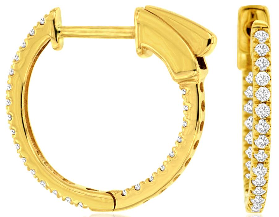 ESTATE 14KT YELLOW GOLD HOOP HANGING EARRINGS. 3D CLASSIC INSIDE OUT DESIGN. DIAMONDS ARE F/G COLOR, VSSI CLARITY .25 CARATS. WRITTEN APPRAISAL AVAILABLE. COMES IN A PRESENTABLE GIFT BOX.