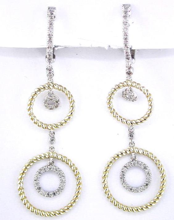 ESTATE 14KT WHITE AND YELLOW GOLD LEVERBACK HANGING EARRINGS. 3D MULTI CIRCULAR DESIGN. DIAMONDS ARE F/G COLOR, VSSI CLARITY .50 CARATS. WRITTEN APPRAISAL AVAILABLE. COMES IN A PRESENTABLE GIFT BOX.