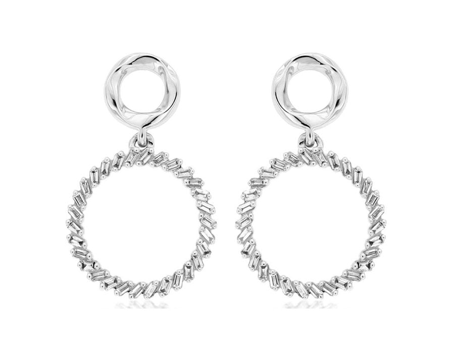 ESTATE 14KT WHITE GOLD FUN HANGING EARRINGS. 3D CIRCULAR DESIGN. BAGUETTE DIAMONDS ARE F/G COLOR, VSSI CLARITY .25 CARATS. WRITTEN APPRAISAL AVAILABLE. COMES IN A PRESENTABLE GIFT BOX.