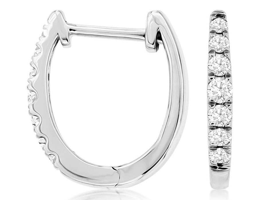 ESTATE 14KT WHITE GOLD HUGGIE HOOP HANGING EARRINGS. 3D CLASSIC JOURNEY DESIGN. ROUND DIAMONDS ARE F/G COLOR, VSSI CLARITY .25 CARATS. WRITTEN APPRAISAL AVAILABLE. COMES IN A PRESENTABLE GIFT BOX.