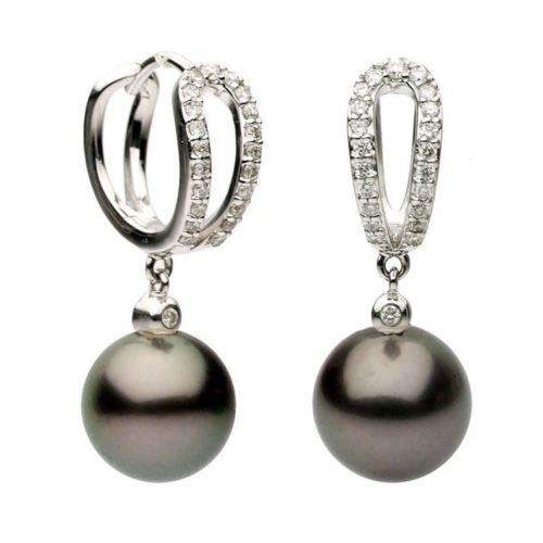 ESTATE 14KT WHITE GOLD HANGING EARRINGS. 3D CLASSIC BEZEL TWO ROW DESIGN. ROUND DIAMONDS ARE F/G COLOR, VSSI CLARITY .26 CARATS. AAA TAHITIAN PEARLS ARE 9mm WIDE. WRITTEN APPRAISAL AVAILABLE. COMES IN A PRESENTABLE GIFT BOX.