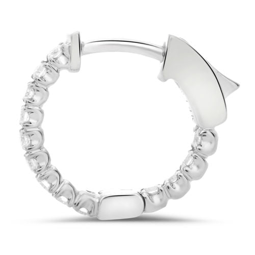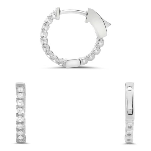 ESTATE 14KT WHITE GOLD HUGGIE HOOP EARRINGS. 3D INSIDE OUT 1/2 INCH DESIGN. DIAMONDS ARE F/G COLOR, VSSI CLARITY .27 CARATS. MEASURES 12mm X 13mm. WRITTEN APPRAISAL AVAILABLE. COMES IN A PRESENTABLE GIFT BOX.