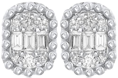 ESTATE 14KT WHITE GOLD STUD EARRINGS. 3D CLUSTER OVAL DESIGN. DIAMONDS ARE F/G COLOR, VSSI CLARITY. ROUND DIAMONDS ARE .12 CARATS. BAGUETTE DIAMONDS ARE .15 CARATS. WRITTEN APPRAISAL AVAILABLE. COMES IN A PRESENTABLE GIFT BOX.