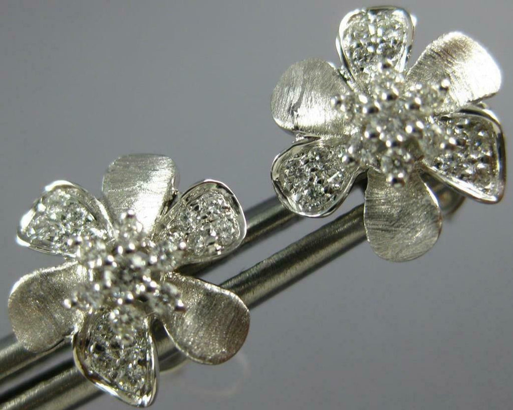ESTATE 18KT WHITEGOLD STUDEARRINGS. 3D CLASSIC FLOWER MATTE AND SHINYDESIGN. DIAMONDS ARE F/G COLOR, VSSI CLARITY .27CARATS.MEASURES 10mm WIDE. WRITTEN APPRAISAL AVAILABLE. COMES IN A PRESENTABLE GIFT BOX.