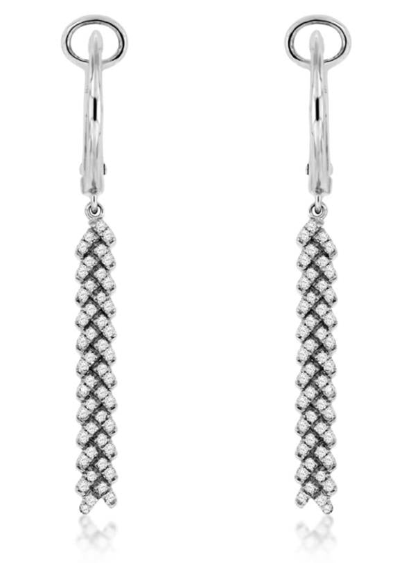 ESTATE 14KT WHITE GOLD CLIP ON HANGING EARRINGS. 3D MULTI ROW V SHAPE DESIGN. DIAMONDS ARE F/G COLOR, VSSI CLARITY .28 CARATS. WRITTEN APPRAISAL AVAILABLE. COMES IN A PRESENTABLE GIFT BOX.