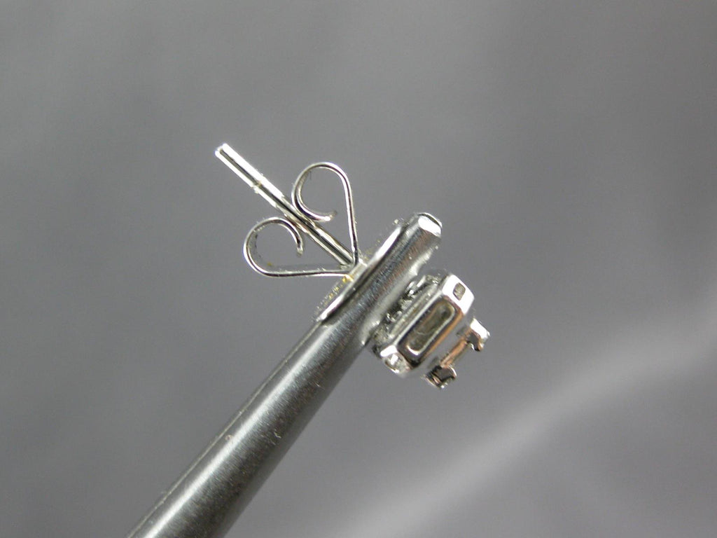 ESTATE 18KT WHITE GOLD STUD EARRINGS. 3D CLASSIC INVISIBLE RECTANGULAR DESIGN. ROUND AND BAGUETTE DIAMONDS ARE F/G COLOR, VSSI CLARITY .28 CARATS. MEASURES 7mm X 6mm. WRITTEN APPRAISAL AVAILABLE. COMES IN A PRESENTABLE GIFT BOX.