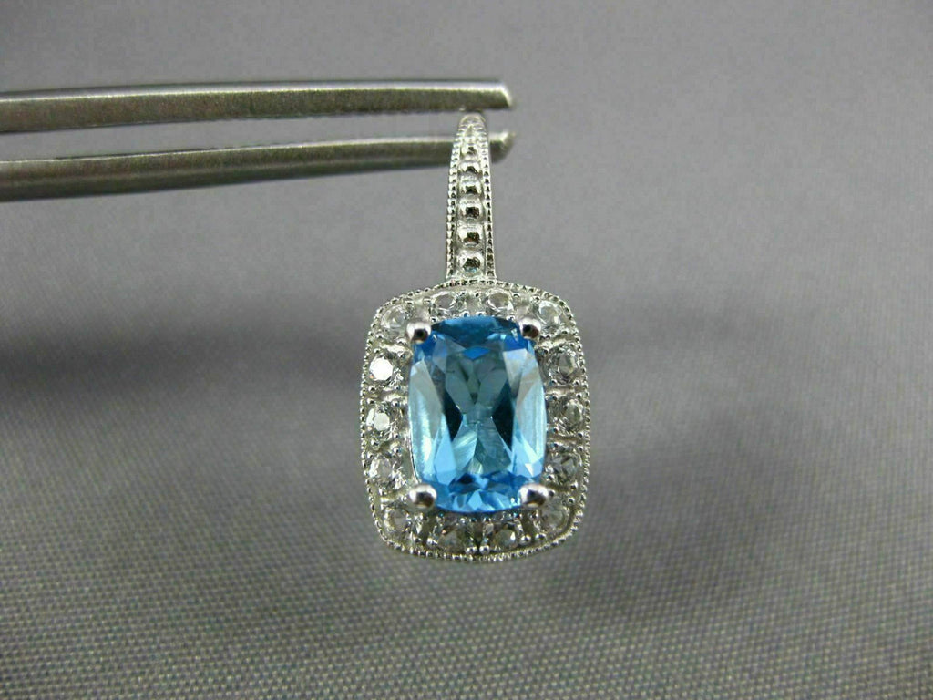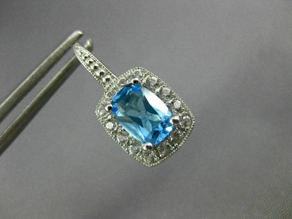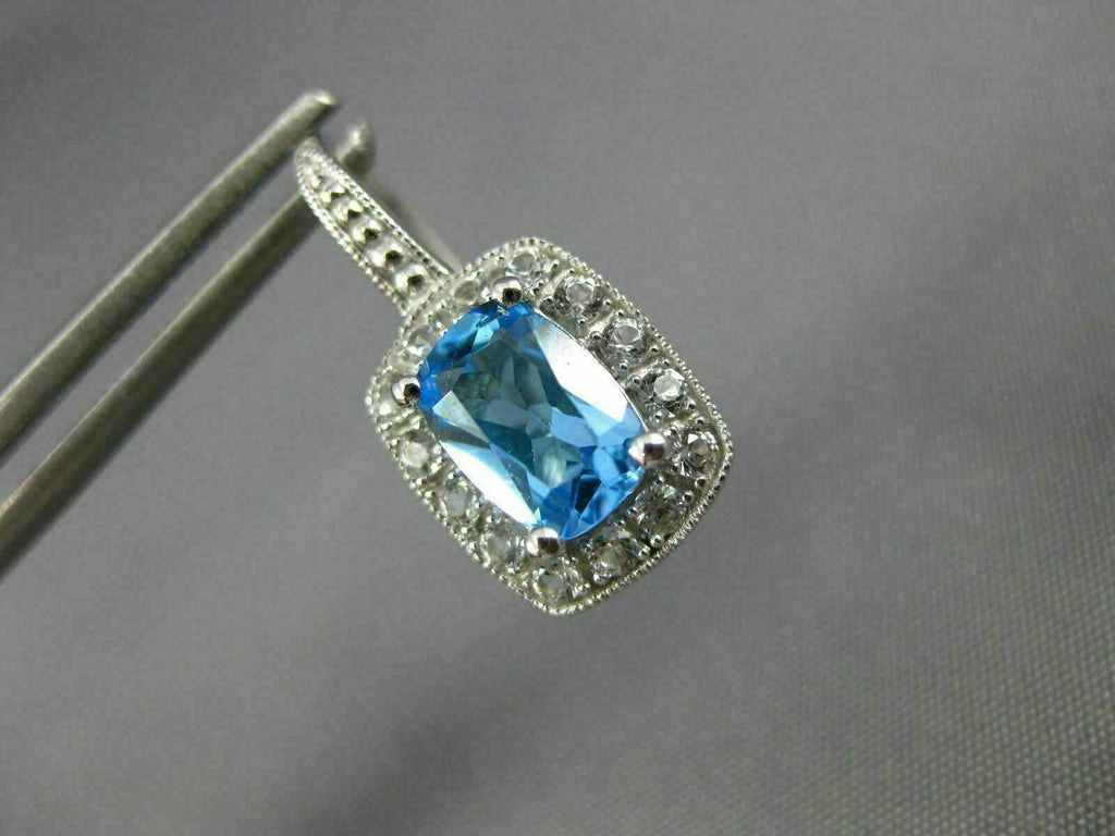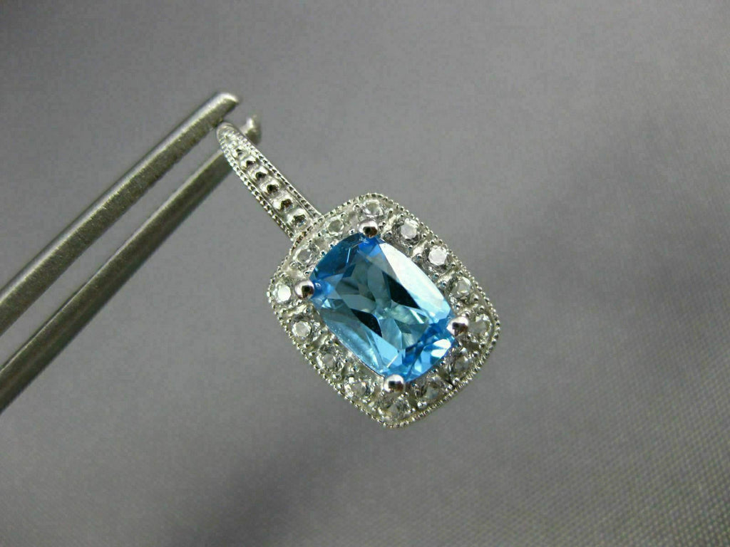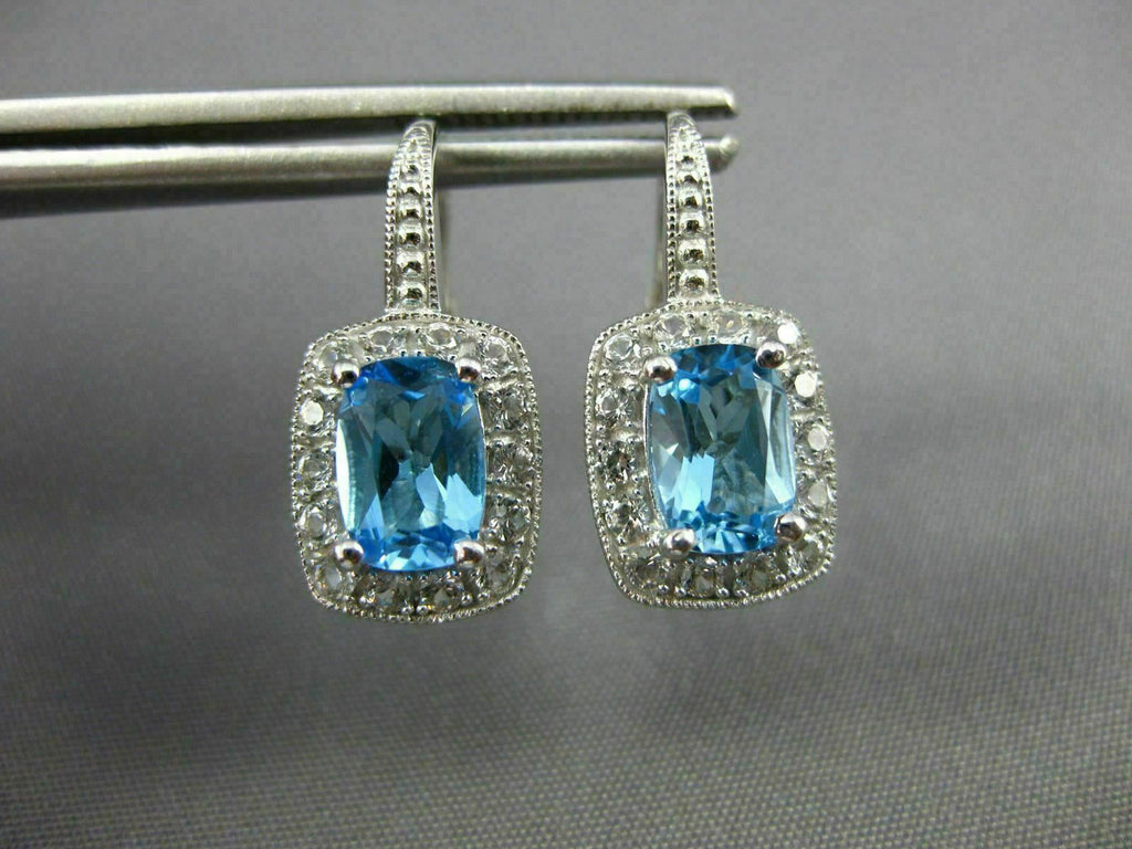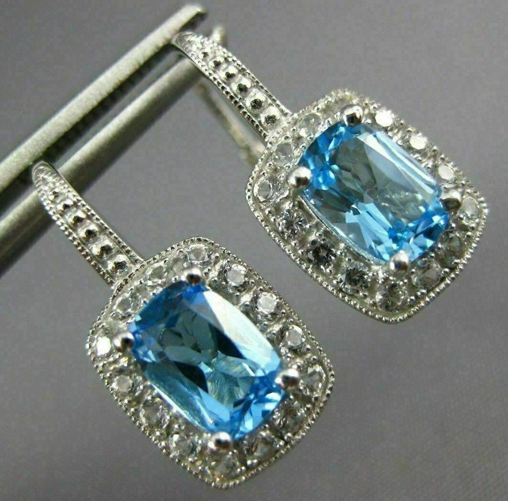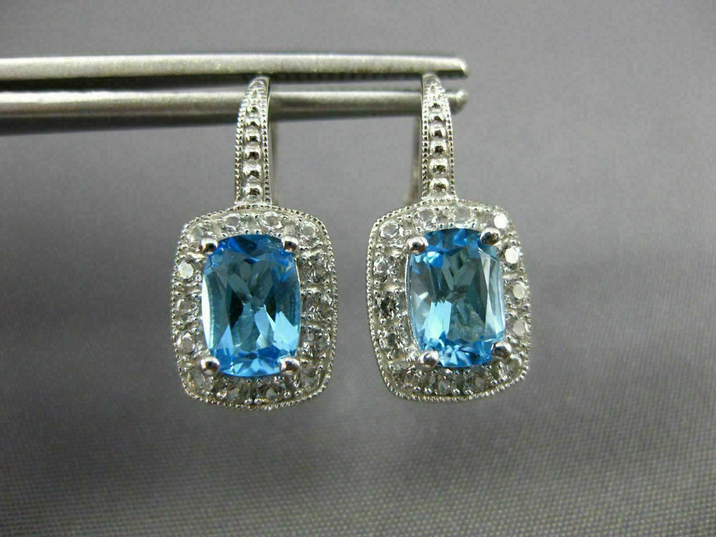 ESTATE 14KT WHITE GOLD LEVERBACK HANGING EARRINGS. 3D RECTANGULAR FILIGREE MILGRAIN DESIGN. CZ ARE .20 CARATS. AAA CUSHION CUT BLUE TOPAZ ARE 3.06 CARATS. MEASURES 19mm X 9mm. WRITTEN APPRAISAL AVAILABLE. COMES IN A PRESENTABLE GIFT BOX.