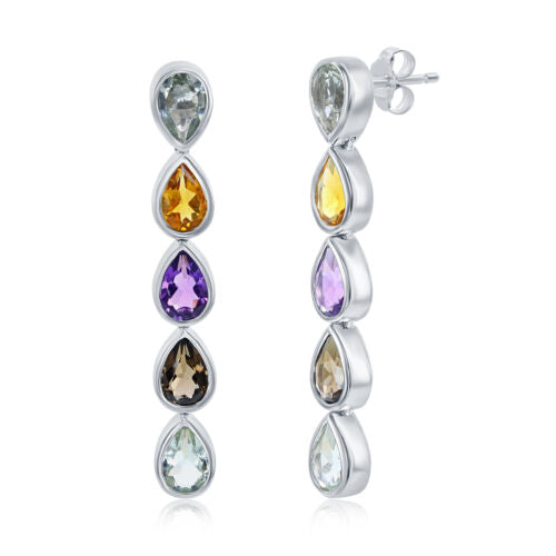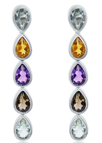 ESTATE 14KT WHITE GOLD HANGING EARRINGS. 3D CLASSIC TEAR DROP DESIGN. AAA EXTRA FACETED PURPLE AMETHYSTS, GREEN AMETHYSTS, CITRINES, AND SMOKEY TOPAZ ARE 3.44 CARATS. WRITTEN APPRAISAL AVAILABLE. COMES IN A PRESENTABLE GIFT BOX.