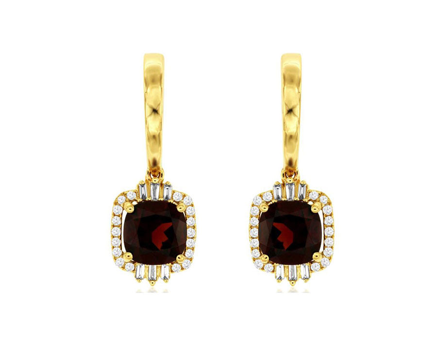 ESTATE 14KT YELLOW GOLD FUN HANGING EARRINGS. 3D SQUARE HALO DESIGN. ROUND AND BAGUETTE DIAMONDS ARE F/G COLOR, VSSI CLARITY .29 CARATS. AAA CUSHION CUT GARNETS ARE 3.30 CARATS. WRITTEN APPRAISAL AVAILABLE. COMES IN A PRESENTABLE GIFT BOX.