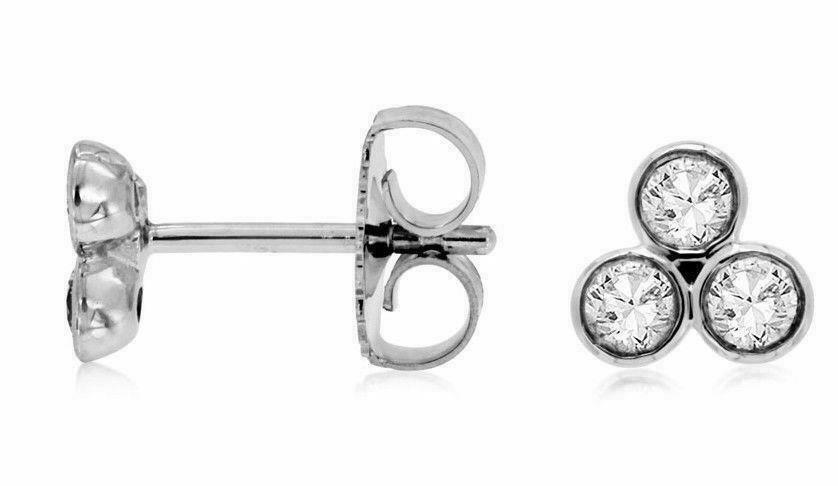 ESTATE 14KT WHITE GOLD LOVE STUD EARRINGS. 3D CLASSIC THREE STONE PAST PRESENT FUTURE BEZEL DESIGN. ROUND DIAMONDS ARE F/G COLOR, VSSI CLARITY .30 CARATS. WRITTEN APPRAISAL AVAILABLE. COMES IN A PRESENTABLE GIFT BOX.