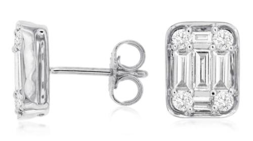 ESTATE 14KT WHITE GOLD STUD EARRINGS. 3D CLASSIC SQUARE DESIGN. ROUND AND BAGUETTE DIAMONDS ARE F/G COLOR, VSSI CLARITY .32 CARATS. COMES IN A PRESENTABLE GIFT BOX.
