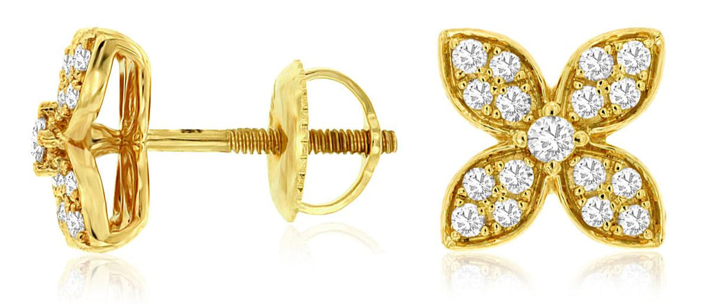 ESTATE 14KT YELLOW GOLD SCREWBACK STUD EARRINGS. 3D FOUR LEAF CLOVER FLOWER DESIGN. DIAMONDS ARE F/G COLOR, VSSI CLARITY .33 CARATS. WRITTEN APPRAISAL AVAILABLE. COMES IN A PRESENTABLE GIFT BOX.