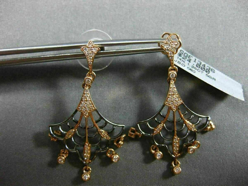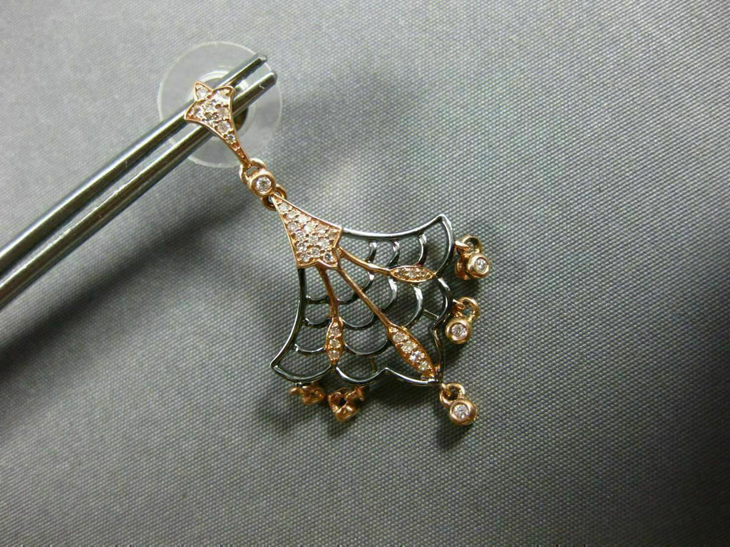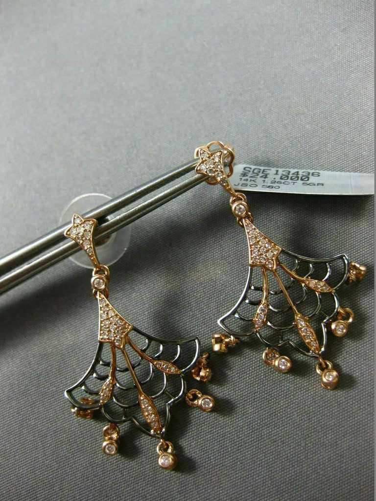 ESTATE 14KT ROSE AND BLACK GOLD HANGING EARRINGS. 3D OPEN FILIGREE ETOILE SPIDER WEB DESIGN. DIAMONDS ARE F/G COLOR, VSSI CLARITY .33 CARATS. MEASURES 38mm X 20mm. WRITTEN APPRAISAL AVAILABLE. COMES IN A PRESENTABLE GIFT BOX