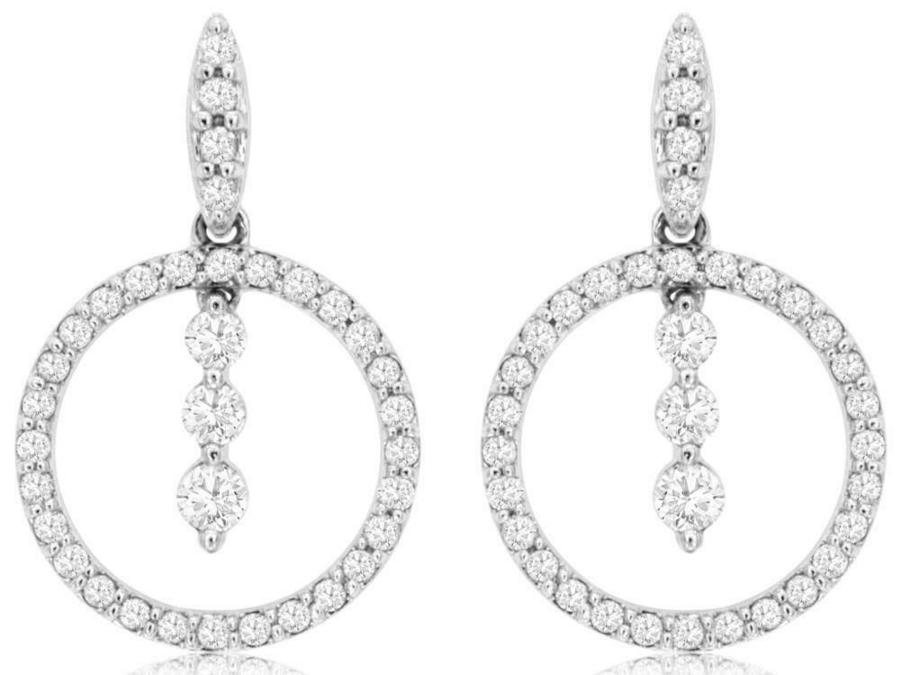 ESTATE 14KT WHITE GOLD FUN HANGING EARRINGS. 3D THREE STONE CIRCLE OF LIFE DESIGN. DIAMONDS ARE F/G COLOR, VSSI CLARITY .33 CARATS. WRITTEN APPRAISAL AVAILABLE. COMES IN A PRESENTABLE GIFT BOX.
