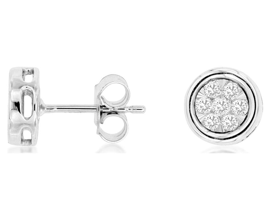 ESTATE 14KT WHITE GOLD STUD EARRINGS. 3D CLUSTER FLOWER BEZEL DESIGN. ROUND DIAMONDS ARE F/G COLOR, VSSI CLARITY .33 CARATS. WRITTEN APPRAISAL AVAILABLE. COMES IN A PRESENTABLE GIFT BOX.