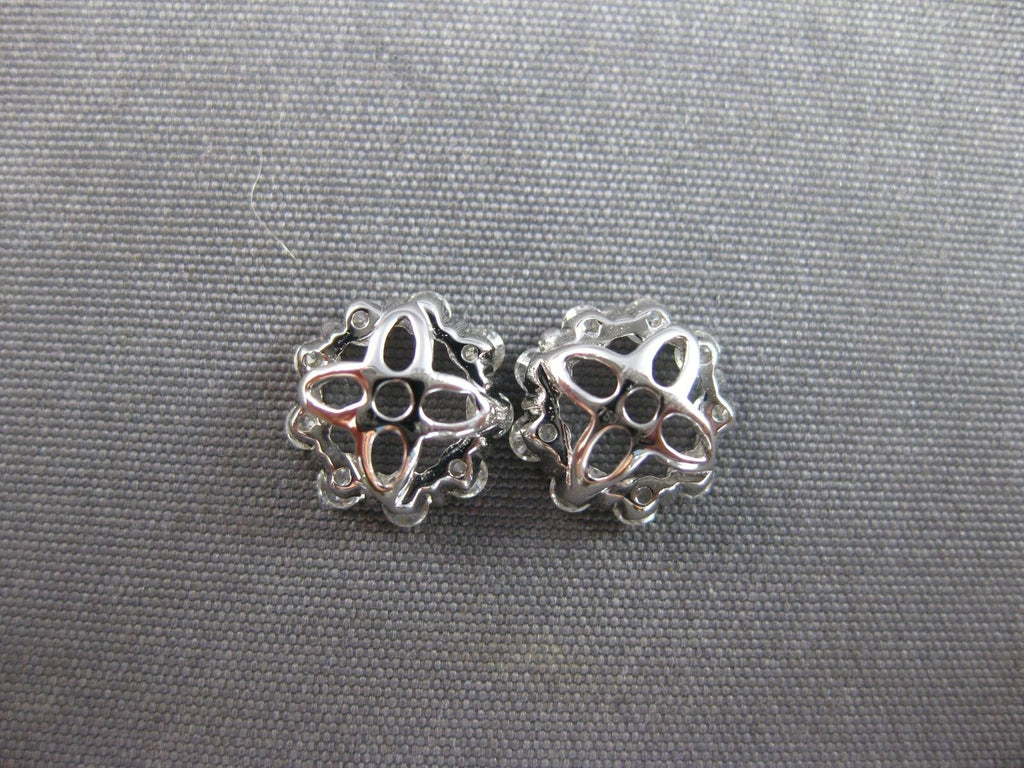 ESTATE 18KT WHITE GOLD EARRING JACKETS. 3D CLASSIC SHARED PRONG DESIGN. ROUND DIAMONDS ARE F/G COLOR, VSSI CLARITY .34 CARATS. MEASURES 8MM WIDE. FITS 4-5MM STONE. WRITTEN APPRAISAL AVAILABLE. COMES IN A PRESENTABLE GIFT BOX.