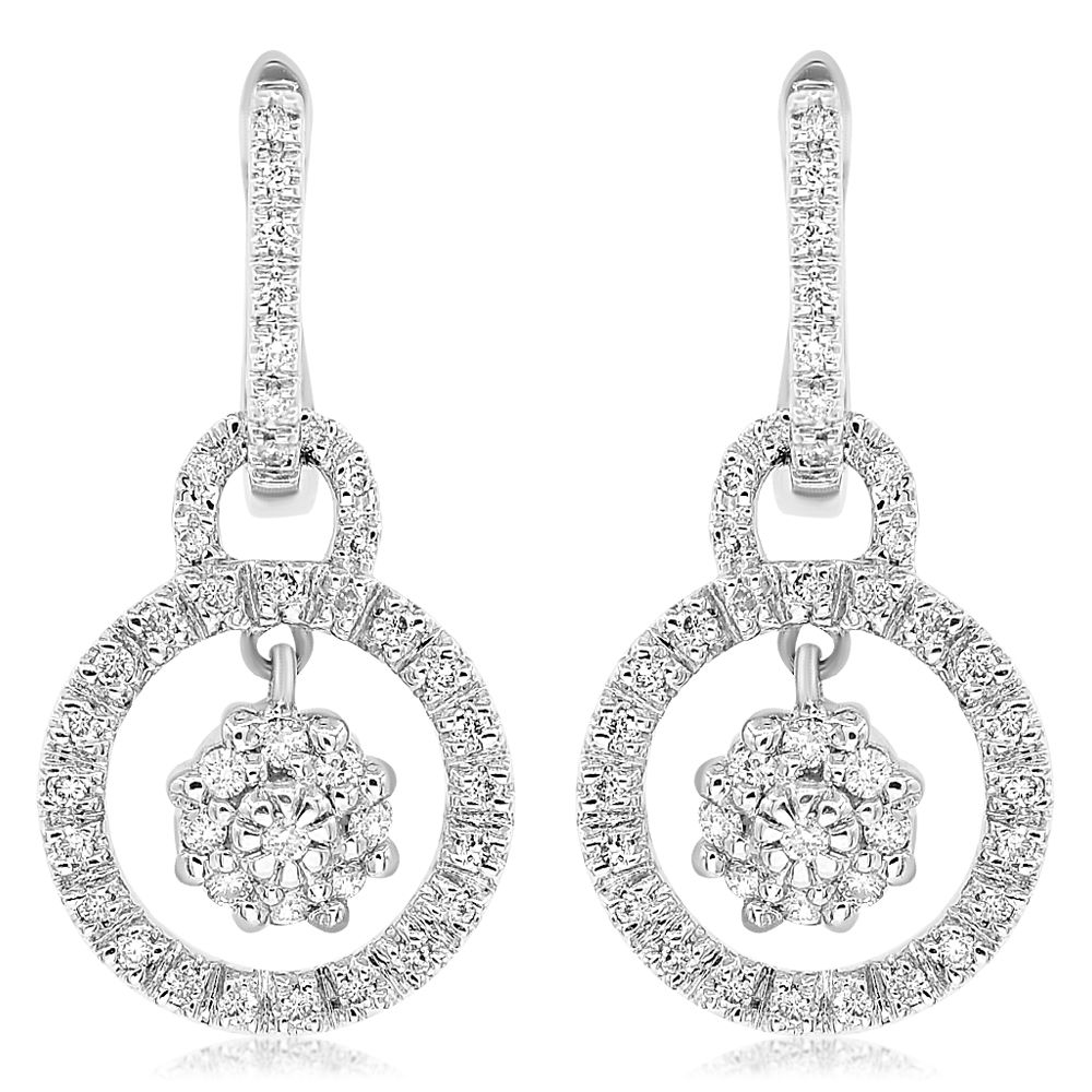 ESTATE 14KT WHITE GOLD HANGING EARRINGS. 3D CLUSTER FLOWER CIRCULAR DESIGN. DIAMONDS ARE F/G COLOR, VSSI CLARITY .35 CARATS. WRITTEN APPRAISAL AVAILABLE. COMES IN A PRESENTABLE GIFT BOX.