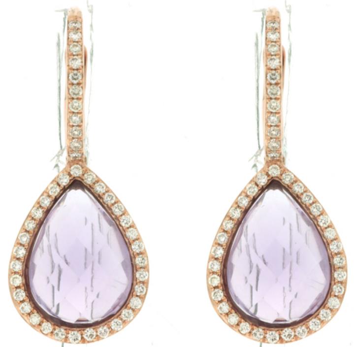 ESTATE 14KT ROSE GOLD HANGING EARRINGS. 3D CLASSIC TEAR DROP DESIGN. DIAMONDS ARE F/G COLOR, VSSI CLARITY .27 CARATS. AAA EXTRA FACETED AMETHYSTS ARE 3.40 CARATS. WRITTEN APPRAISAL AVAILABLE. COMES IN A PRESENTABLE GIFT BOX.