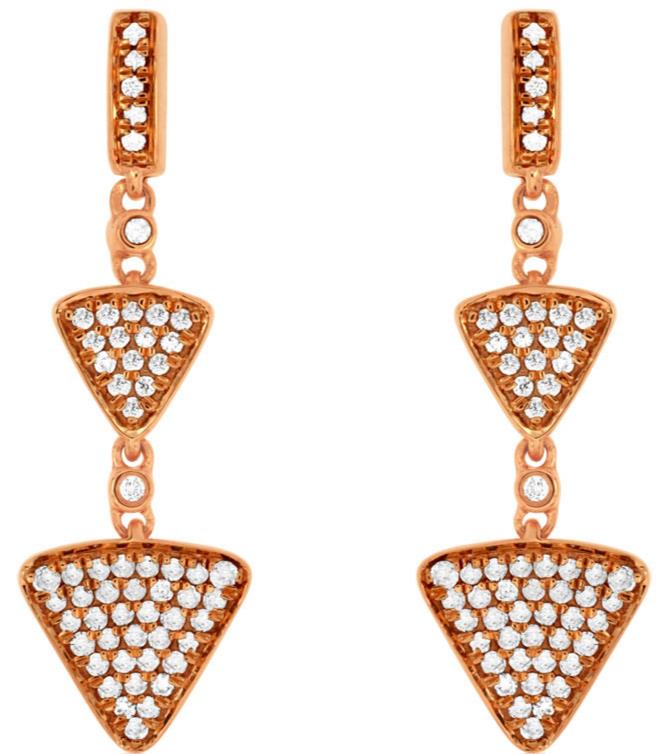 ESTATE 14KT ROSE GOLD HANGING EARRINGS. 3D TRIANGULAR JOURNEY DESIGN. ROUND DIAMONDS ARE F/G COLOR, VSSI CLARITY .36 CARATS. WRITTEN APPRAISAL AVAILABLE. COMES IN A PRESENTABLE GIFT BOX.