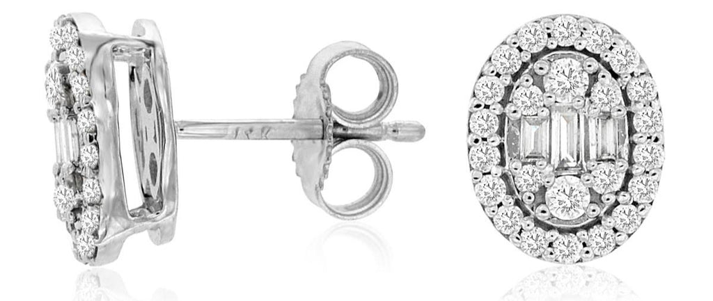 ESTATE 14KT WHITE GOLD STUD EARRINGS. 3D CLUSTER OVAL DESIGN. ROUND AND BAGUETTE DIAMONDS ARE F/G COLOR, VSSI CLARITY .36 CARATS. WRITTEN APPRAISAL AVAILABLE. COMES IN A PRESENTABLE GIFT BOX.