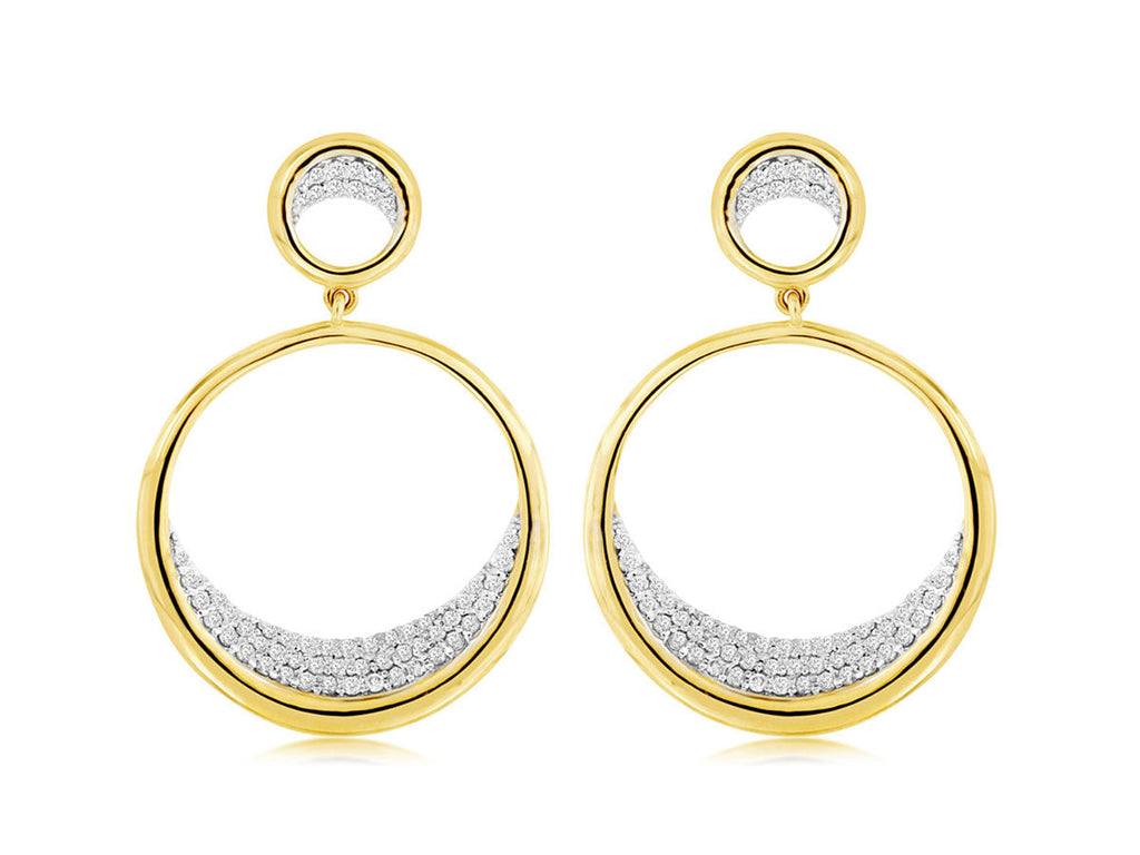 ESTATE 14KT WHITE AND YELLOW GOLD HANGING EARRINGS. 3D DOUBLE CIRCULAR HAPPY FACE DESIGN. ROUND DIAMONDS ARE F/G COLOR, VSSI CLARITY .38 CARATS. WRITTEN APPRAISAL AVAILABLE. COMES IN A PRESENTABLE GIFT BOX.