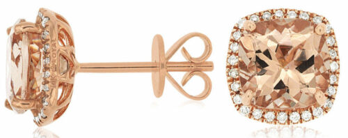 ESTATE 14KT ROSE GOLD STUD EARRINGS. 3D HALO DESIGN. DIAMONDS ARE F/G COLOR, VSSI CLARITY .21 CARATS. AAA EXTRA FACETED CUSHION CUT MORGANITES ARE 4.0 CARATS. WRITTEN APPRAISAL AVAILABLE. COMES IN A PRESENTABLE GIFT BOX.