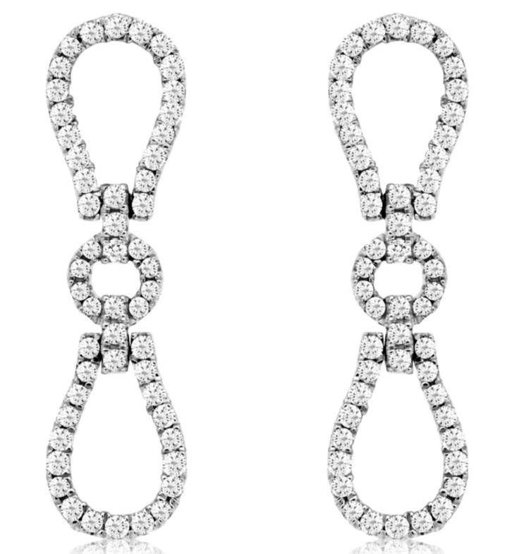 ESTATE 14KT WHITE GOLD FUN HANGING EARRINGS. 3D LOVE KNOT DESIGN. ROUND DIAMONDS ARE F/G COLOR, VSSI CLARITY .42 CARATS. WRITTEN APPRAISAL AVAILABLE. COMES IN A PRESENTABLE GIFT BOX.