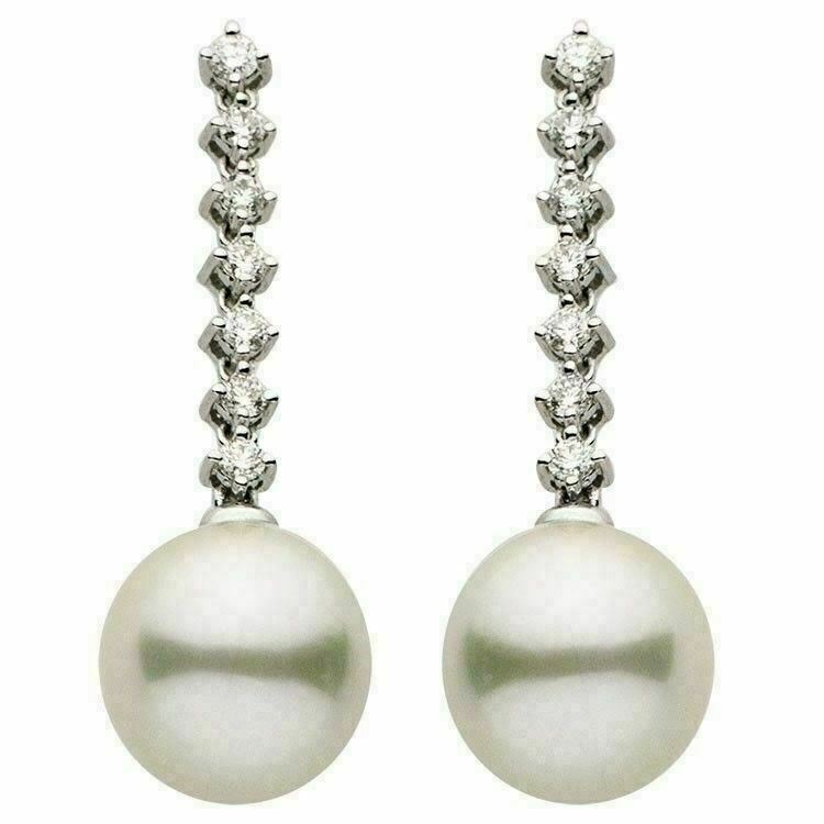 ESTATE 18KT WHITE GOLD HANGING EARRINGS. 3D CLASSIC 7 STONE DESIGN. DIAMONDS ARE F/G COLOR, VSSI CLARITY .42 CARATS. AAA SOUTH SEA PEARLS ARE 10-11MM WIDE. WRITTEN APPRAISAL AVAILABLE. COMES IN A PRESENTABLE GIFT BOX.