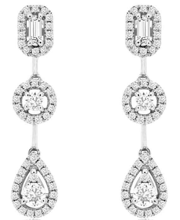 ESTATE 14KT WHITE GOLD HANGING EARRINGS. 3D HALO PAST PRESENT FUTURE TEAR DROP DESIGN. DIAMONDS ARE F/G COLOR, VSSI CLARITY. ROUND DIAMONDS ARE .38 CARATS. BAGUETTE DIAMONDS ARE .05CARATS. WRITTEN APPRAISAL AVAILABLE. COMES IN A PRESENTABLE GIFT BOX.
