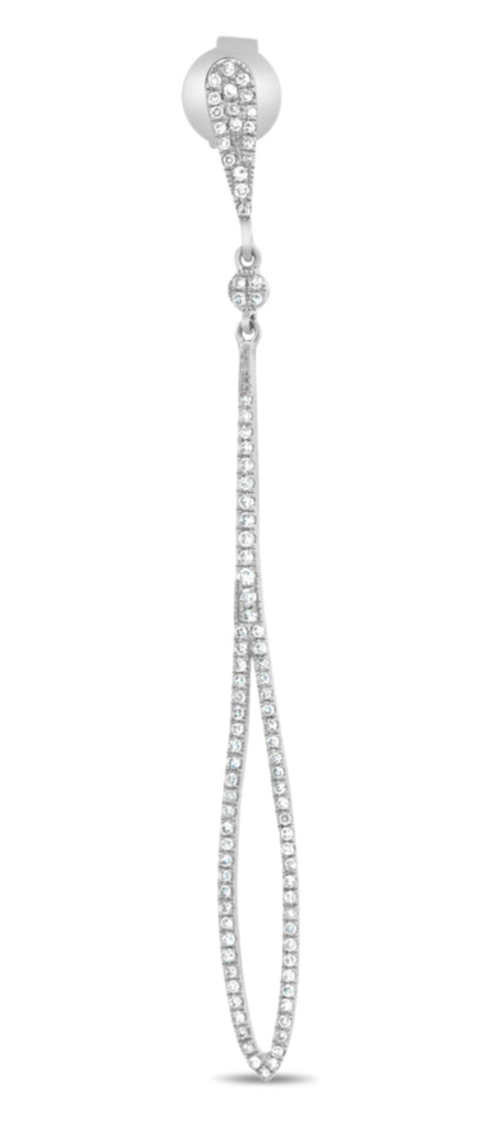 ESTATE 14KT WHITE GOLD HANGING EARRINGS. 3D CLASSIC ELONGATED TEAR DROP DESIGN. ROUND DIAMONDS ARE F/G COLOR, VSSI CLARITY 0.45 CARATS. MEASURES 56mm X 5mm. WRITTEN APPRAISAL AVAILABLE. COMES IN A PRESENTABLE GIFT BOX.