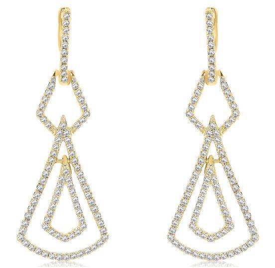 ESTATE 14KT YELLOW GOLD HANGING EARRINGS. 3D TRIANGULAR TEAR DROP DESIGN. DIAMONDS ARE F/G COLOR, VSSI CLARITY .45 CARATS. WRITTEN APPRAISAL AVAILABLE. COMES IN A PRESENTABLE GIFT BOX.