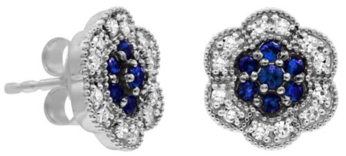 ESTATE 14KT WHITE GOLD STUD EARRINGS. 3D CLASSIC FLOWER FILIGREE DESIGN. ROUND DIAMONDS ARE F/G COLOR, VSSI CLARITY .20 CARATS. AAA ROUND SAPPHIRES ARE .25 CARATS. WRITTEN APPRAISAL AVAILABLE. COMES IN A PRESENTABLE GIFT BOX.