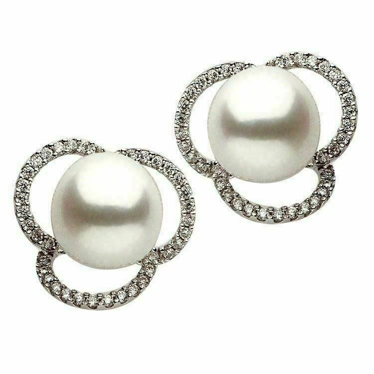 ESTATE 14KT WHITE GOLD STUD EARRINGS. 3D ROUND FLOWER ROSE DESIGN. DIAMONDS ARE F/G COLOR, VSSI CLARITY .45 CARATS. AAA SOUTH SEA PEARLS ARE 9-10MM WIDE. WRITTEN APPRAISAL AVAILABLE. COMES IN A PRESENTABLE GIFT BOX