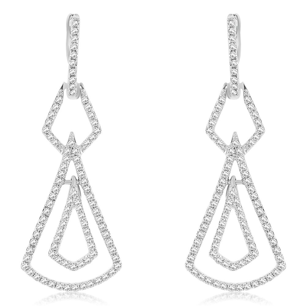 ESTATE 14KT WHITE GOLD HANGING EARRINGS. 3D TRIANGULAR TEAR DROP DESIGN. DIAMONDS ARE F/G COLOR, VSSI CLARITY .46 CARATS. WRITTEN APPRAISAL AVAILABLE. COMES IN A PRESENTABLE GIFT BOX.
