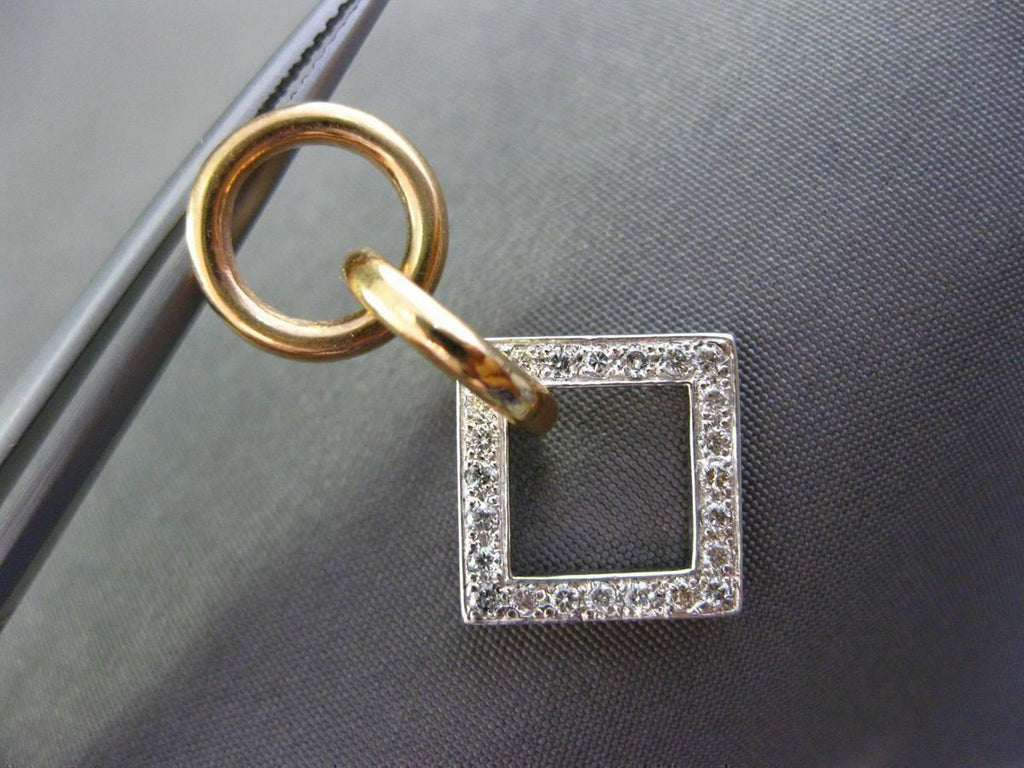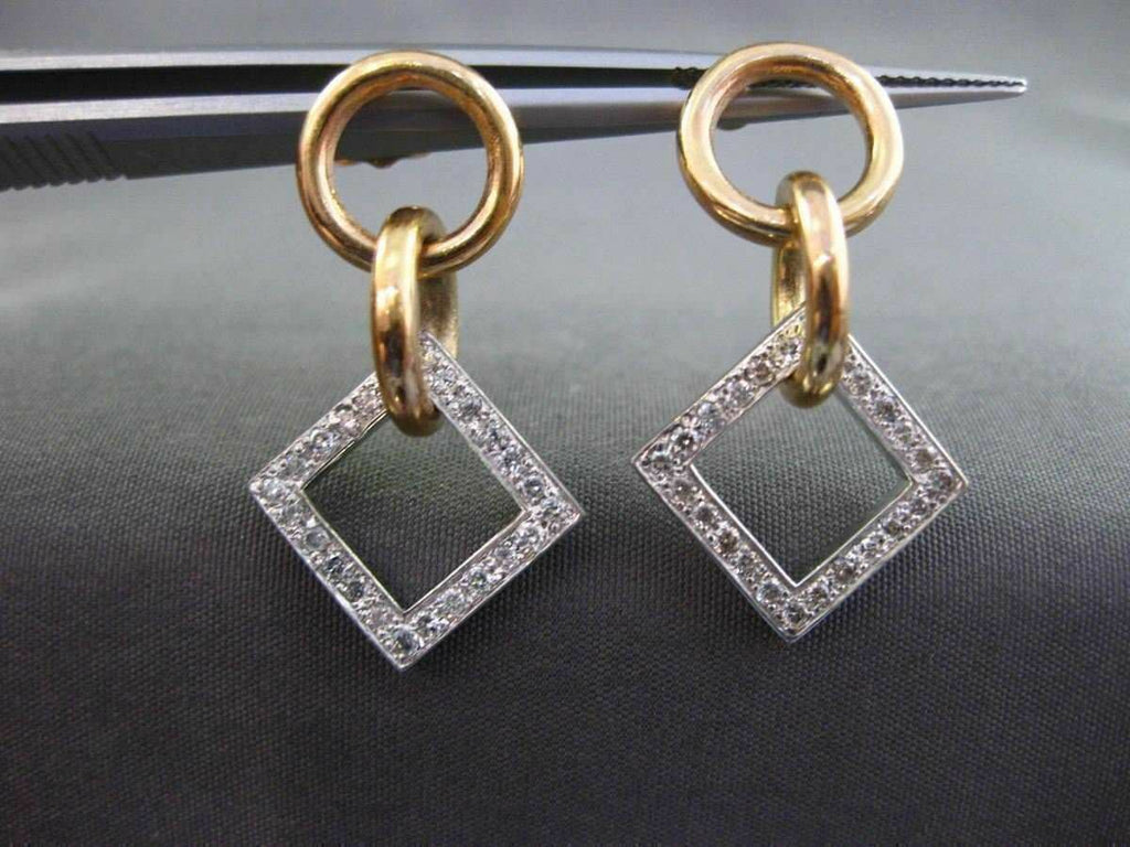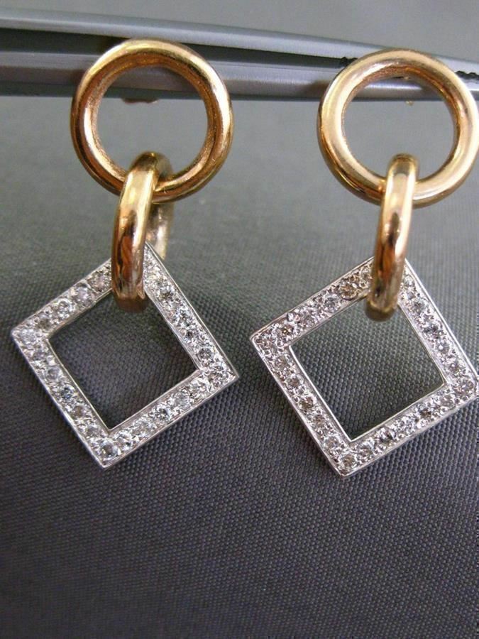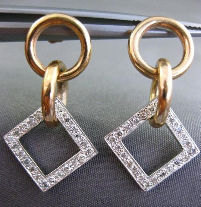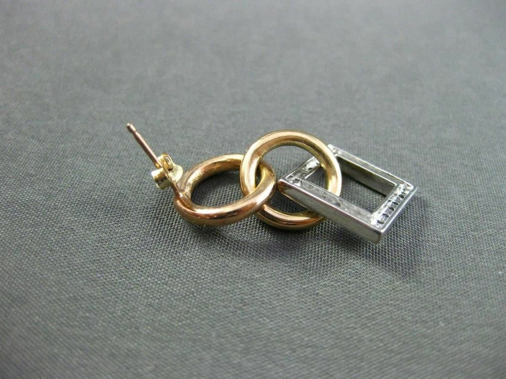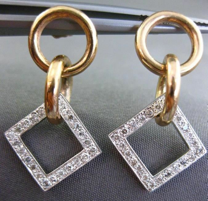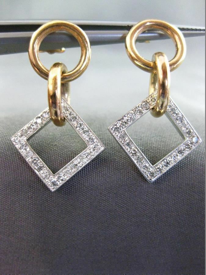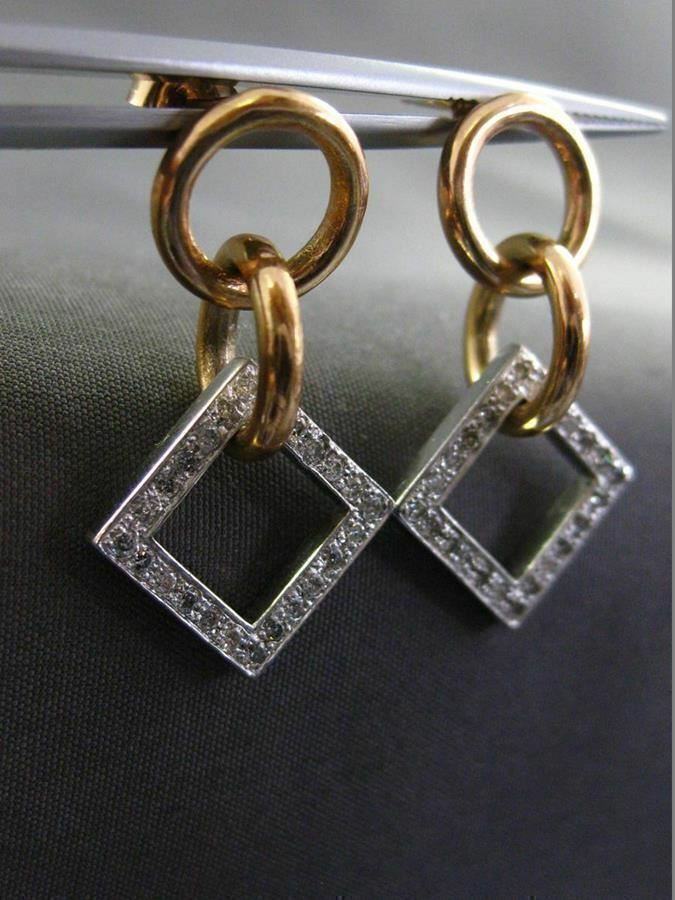 ESTATE 14KT WHITE AND ROSE GOLD HANGING EARRINGS. 3D CIRCLE AND SQUARE DESIGN. DIAMONDS ARE F/G COLOR, VSSI CLARITY .46 CARATS. MEASURES 30mm X 11mm WIDE. WRITTEN APPRAISAL AVAILABLE. COMES IN A PRESENTABLE GIFT BOX