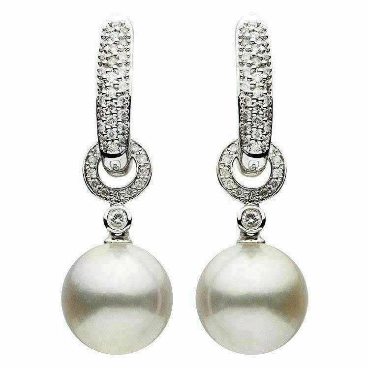 ESTATE 18KT WHITE GOLD HUGGIE HANGING EARRINGS. 3D BEZEL CIRCULAR PAVE DESIGN. ROUND DIAMONDS ARE F/G COLOR, VSSI CLARITY .49 CARATS. AAA SOUTH SEA PEARLS ARE 11-12MM WIDE. WRITTEN APPRAISAL AVAILABLE. COMES IN A PRESENTABLE GIFT BOX.