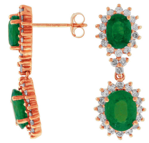 ESTATE 14KT ROSE GOLD HANGING EARRINGS. 3D OVAL HALO DESIGN. DIAMONDS ARE F/G COLOR, VSSI CLARITY 1.30 CARATS. AAA EMERALDS ARE 3.80 CARATS. WRITTEN APPRAISAL AVAILABLE. COMES IN A PRESENTABLE GIFT BOX.