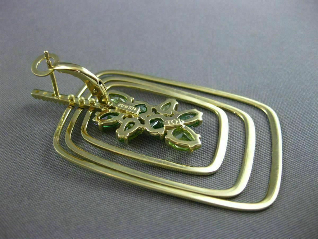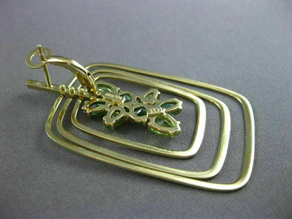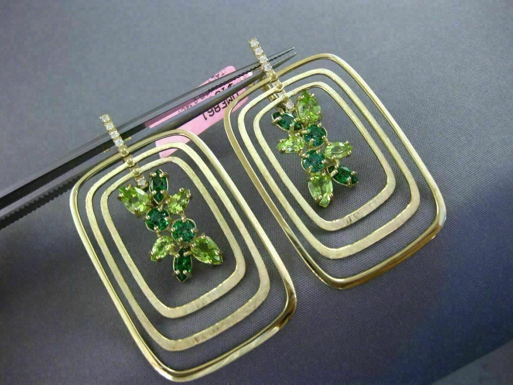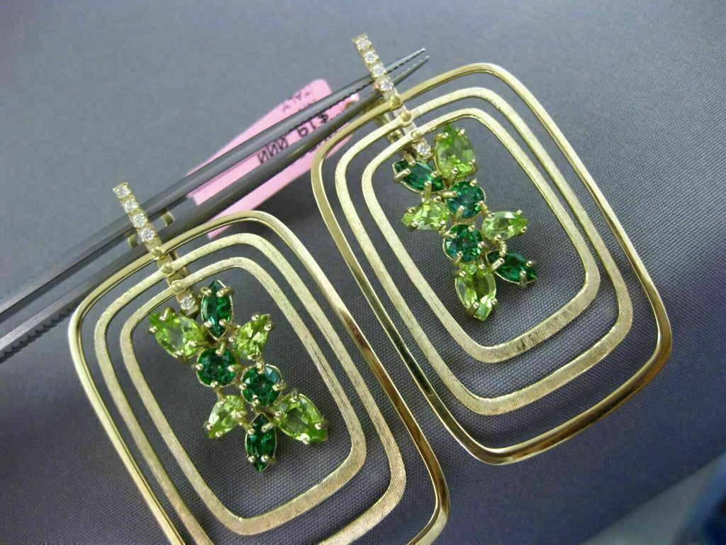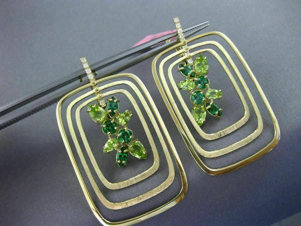 ESTATE 14KT YELLOW GOLD HANGINGEARRINGS. 3D RECTANGULAR CLUSTER DESIGN. DIAMONDS ARE F/G COLOR, VSSICLARITY .14 CARATS. AAA PERIDOTS AND TSAVORITES ARE 5.50CARATS. MEASURES 49mm X 28mm. WRITTEN APPRAISAL AVAILABLE. COMES IN A PRESENTABLE GIFT BOX