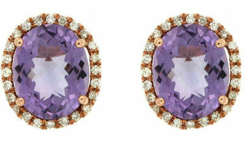 ESTATE 14KT ROSE GOLD STUD EARRINGS. 3D HALODESIGN. ROUND DIAMONDS ARE F/G COLOR, VSSI CLARITY .35 CARATS.AAA EXTRA FACETED OVAL AMETHYST IS 5.30 CARATS. WRITTEN APPRAISAL AVAILABLE. COMES IN A PRESENTABLE GIFT BOX.