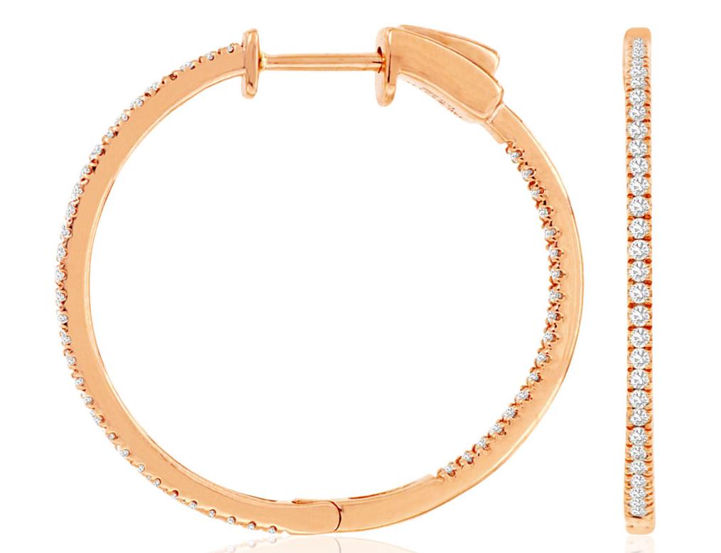 ESTATE 14KT ROSE GOLD HOOP HANGING EARRINGS. 3D CLASSIC INSIDE OUT DESIGN. DIAMONDS ARE F/G COLOR, VSSI CLARITY .50 CARATS. WRITTEN APPRAISAL AVAILABLE. COMES IN A PRESENTABLE GIFT BOX.