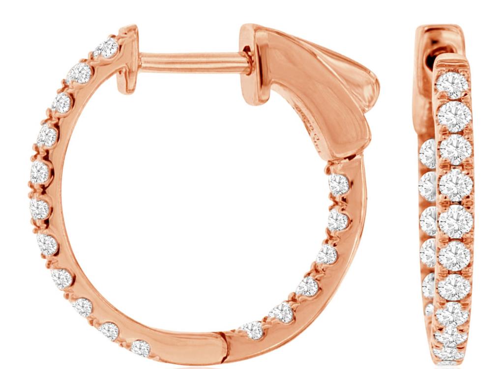 ESTATE 14KT ROSE GOLD HUGGIE HOOP HANGING EARRINGS. 3D CLASSIC INSIDE OUT DESIGN. DIAMONDS ARE F/G COLOR, VSSI CLARITY .25 CARATS. WRITTEN APPRAISAL AVAILABLE. COMES IN A PRESENTABLE GIFT BOX.