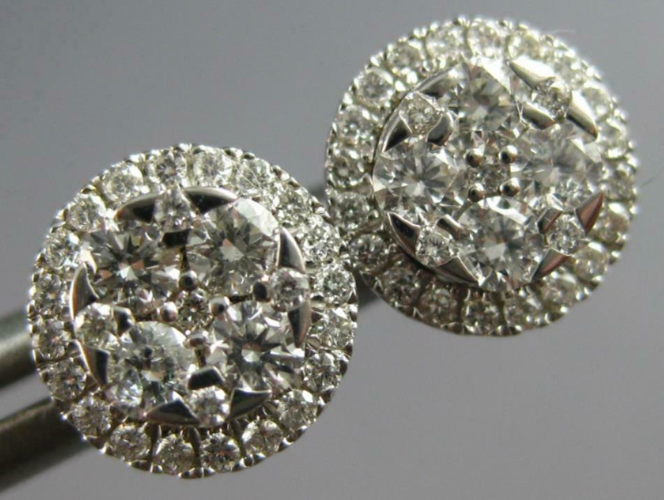 ESTATE 14KT WHITE GOLD STUD EARRINGS. 3D CLASSIC CLUSTER HALO DESIGN. ROUND DIAMONDS ARE F/G COLOR, VSSI CLARITY .52 CARATS. MEASURES 7.5MM WIDE. WRITTEN APPRAISAL AVAILABLE. COMES IN A PRESENTABLE GIFT BOX.