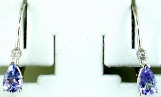 ESTATE 14KT WHITE GOLD LEVERBACK HANGING EARRINGS. 3D TEAR DROP DESIGN. ROUND DIAMONDS ARE F/G COLOR, VSSI CLARITY .02 CARATS. AAA PEAR SHAPE TANZANITES ARE .50 CARATS. WRITTEN APPRAISAL AVAILABLE. COMES IN A PRESENTABLE GIFT BOX.