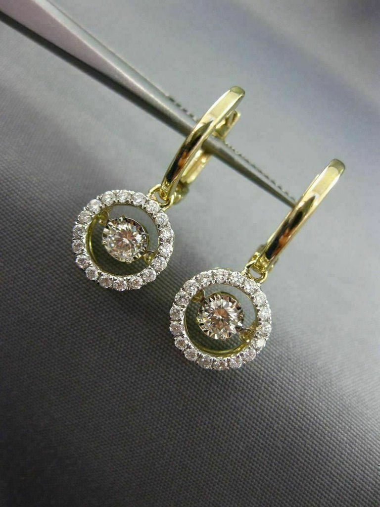 ESTATE 14KT YELLOW LEVERBACK HANGING FLOATING EARRINGS. 3D SOLITAIRE HALO DESIGN. DIAMONDS ARE F/G COLOR, VSSI CLARITY .53 CARATS. MEASURES 21mm X 9mm. WRITTEN APPRAISAL AVAILABLE. COMES IN A PRESENTABLE GIFT BOX